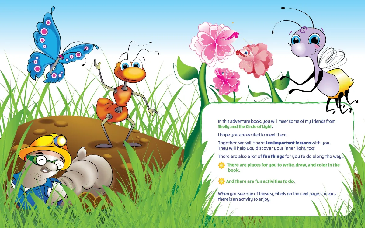 Welcome to your illustrated resource for guiding your children and youth summer-camp groups, classrooms, or church groups through the activities found in the Shelly Shines Activity Book. The Shelly Concept goes beyond the children’s story. She endeavors to teach each child and, by extension, the adults involved to think beyond themselves and to see the world as a place of joy, service, and abundance. This guide was written to help you define how to engage with your students, how to choose topics of discussion, and how to encourage them to internalize the lessons learned as well as share the fruits of their experiences.